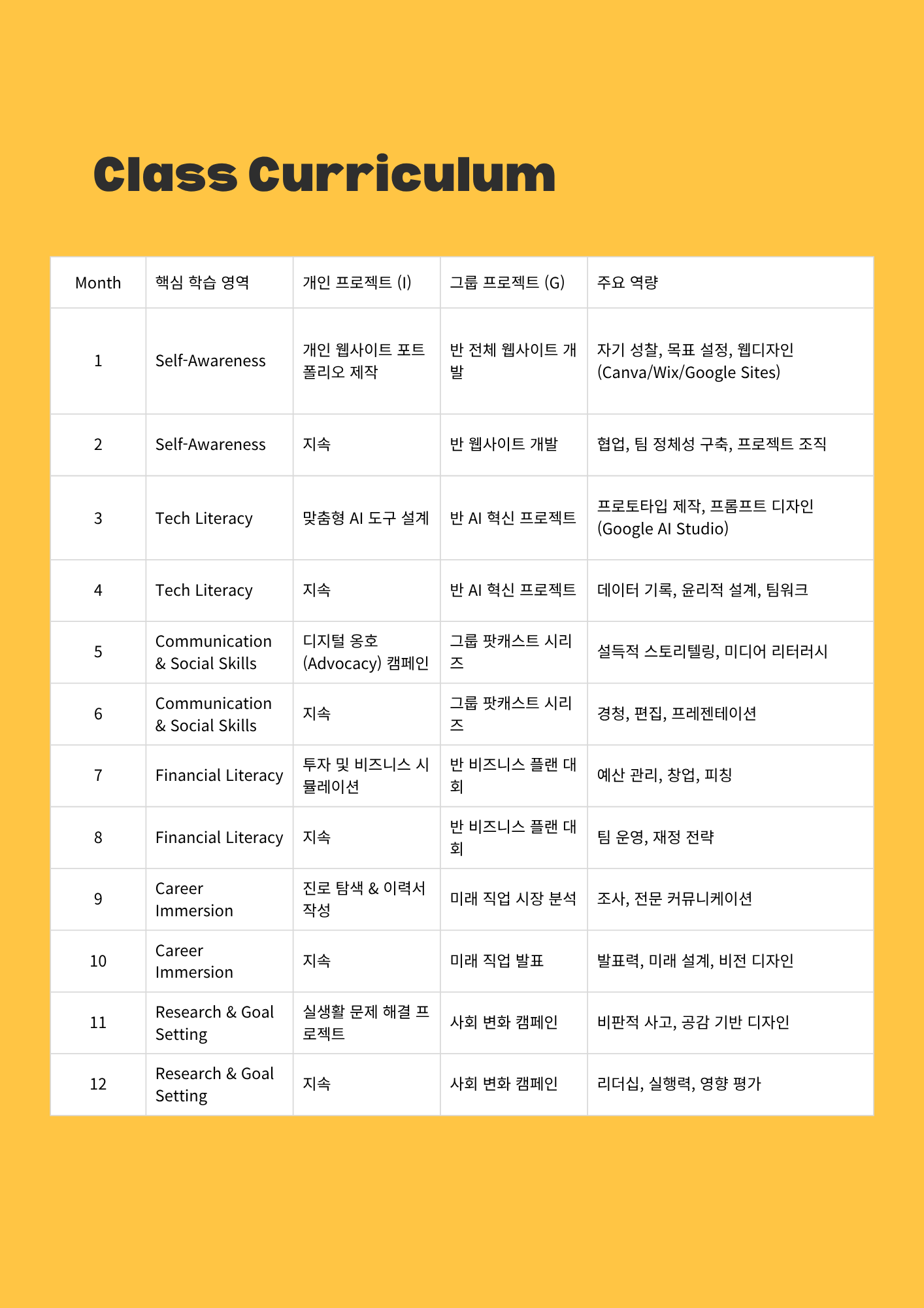 Month | Core Learning Pillar | Individual Project (I) | Group Project (G) | Key Skills Developed |